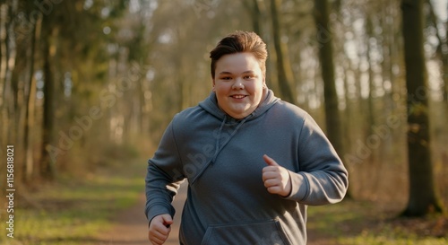 Obraz premium Teen caucasian boy jogging in forest trail for fitness and wellness inspiration
