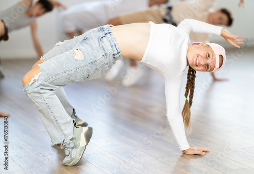 Naklejka premium Teen girl dancing breakdance in group of teenagers in studio