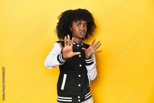 © Asier, Obraz premium Teen girl in baseball jacket, yellow studio background being shocked due to an imminent danger