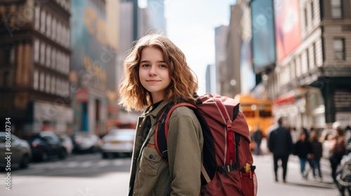© CStock, Fototapeta premium Teen girl with backpack standing on city