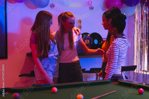 Naklejka premium Teen girls celebrating together around pool table, enjoying festive party...