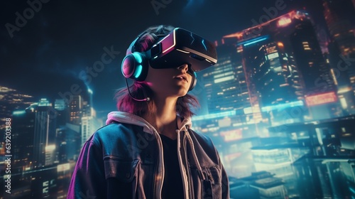 Fototapeta premium Teen is wearing virtual reality glasses. Beautiful illustration picture. Generative AI