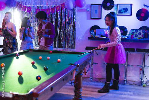 Fototapeta premium Teen playing pool at birthday party, friends enjoying music and snacks nearby
