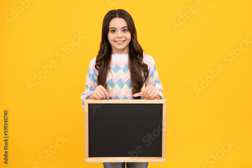 Naklejka premium Teen schoolgirl hold blackboard. Child advertising. Back to school.