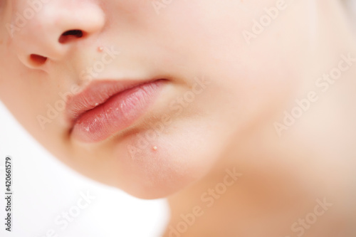 Obraz premium Teenage acne on the chin. Close up face with pimple. Teen problem. High quality photo.