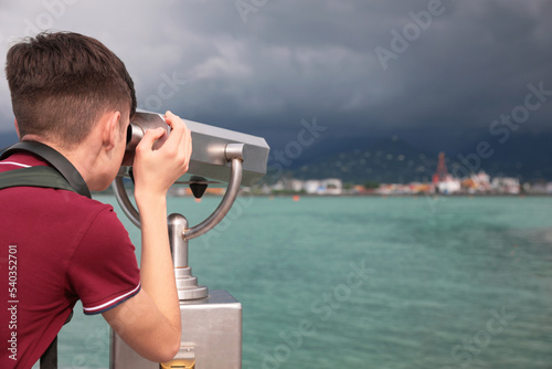 Obraz premium Teenage boy looking through mounted binoculars at mountains. Space for text
