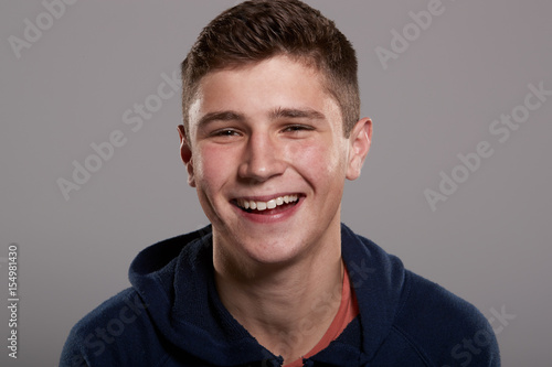 Fototapeta premium Teenage boy smiling to camera, head and shoulders portrait