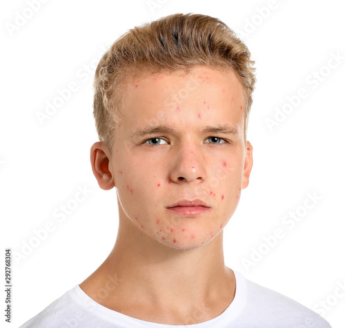 © Pixel-Shot, Obraz premium Teenage boy with acne problem on white background