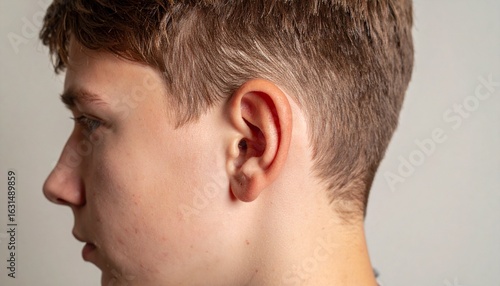 © Photo by mQ, Obraz premium Teenage boy with uniquely shaped ears and a piercing, intense gaze, captured in moody lighting against a neutral backdrop, evoking emotion and introspection.