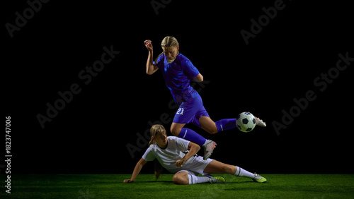 © Lustre Art Group , Fototapeta premium Teenage female soccer players in sliding tackle duel during active play. Concept of youth defensive training, contact-technique instruction, tactical coaching, match analysis.