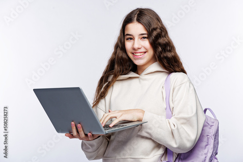 © Teodor Lazarev, Naklejka premium Teenage girl looking at her laptop, getting ready for school and finishing homework