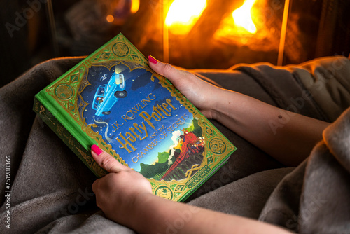 © Olga, Naklejka premium Teenage girl reading the second book about Harry Potter near the fireplace. "Harry Potter and the Chamber of Secrets"