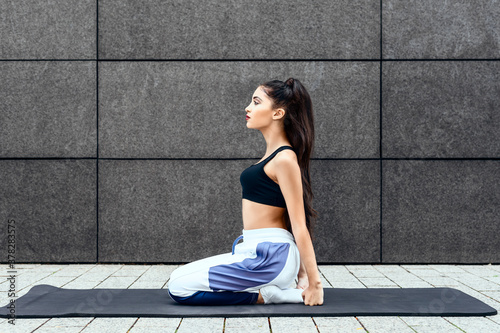 © Shotmedia, Fototapeta premium teenage girl sit on mat outdoors in urban city with sportswear and braided hair relaxing and meditating after yoga workout while concentrating on natural inner peace