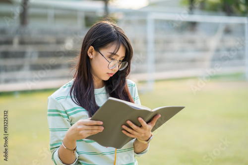 Obraz premium Teenage girl wearing eyeglasses standing Read a notebook in football field at...