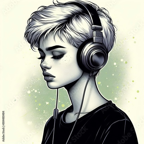 © D.Kaminsky, Fototapeta premium Teenage girl with a white pixie haircut in a black T-shirt listens to music