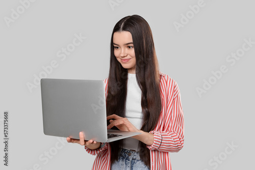 © New Africa, Naklejka premium Teenage girl with laptop on light grey background