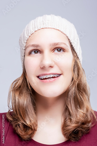 © danmorgan12, Fototapeta premium Teenage Ideas. Closeup Portrait of Positive Caucasian Teenager Girl Wearing Teeth Brackets. Posing Against Gray.