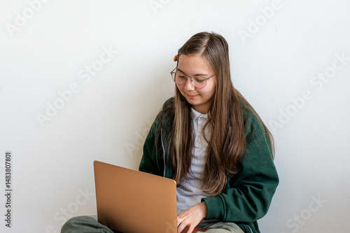 © Oksana, Naklejka premium Teenage student holding a laptop on white background