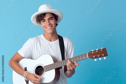 © YULIYA, Obraz premium Teenager boy playing the guitar on blue background.