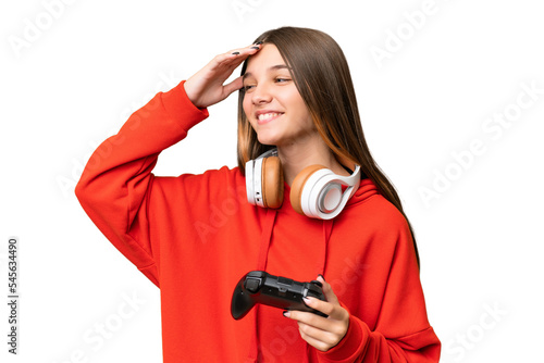 Obraz premium Teenager caucasian girl playing with a video game controller over isolated background smiling a lot
