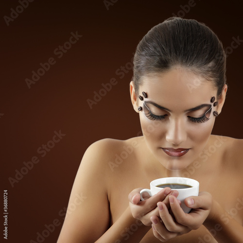 Fototapeta premium teenager girl drinking coffee with beautiful make-up isolated on
