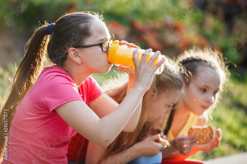 © olgasparrow, Naklejka premium Teenager girl drinks from glass.
