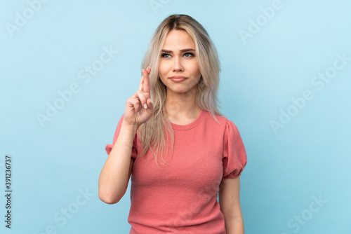 Fototapeta premium Teenager girl over isolated blue background with fingers crossing and wishing the best