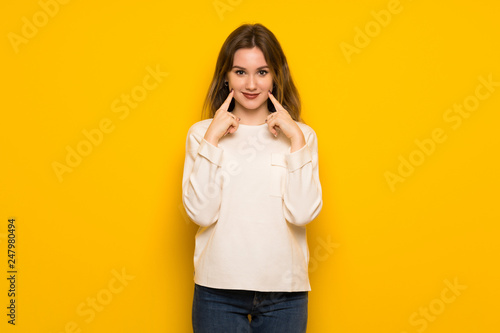 Fototapeta premium Teenager girl over yellow wall smiling with a happy and pleasant expression
