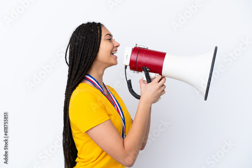 Naklejka premium Teenager girl with braids and medals over isolated pink background shouting through a megaphone