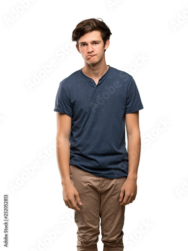 © luismolinero, Fototapeta premium Teenager man with confuse face expression while bites lip over isolated white background