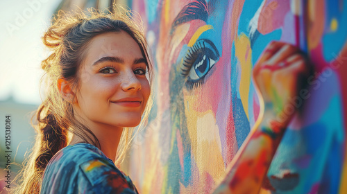 Fototapeta premium Teenager painting a mural on an urban wall, with vibrant colors and graffiti...