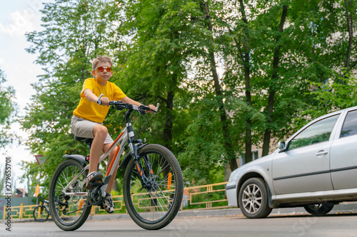 © Дмитрий Ногаев, Obraz premium Teenager rides a bicycle on the roadway