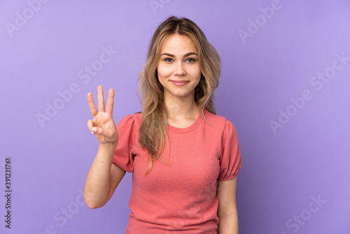 Fototapeta premium Teenager Russian girl isolated on purple background happy and counting three with fingers