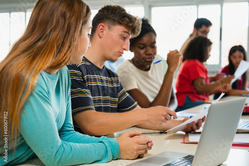 © EFStock, Fototapeta premium Teenager students learning together at High School Classroom, doing exercise