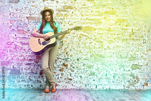 Obraz premium teenager style portrait of young woman playing acoustic guitar