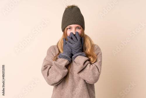 © luismolinero, Obraz premium Teenager Ukrainian girl with winter hat isolated on beige background with surprise facial expression