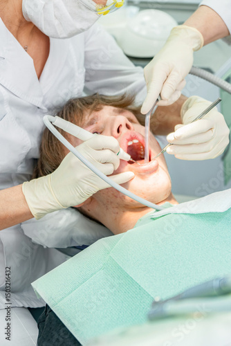 Obraz premium Teenager undergoes dental procedures in a bright clinic with professionals...