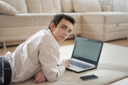 Naklejka premium Teenager young man lying on carpet and using laptop at home