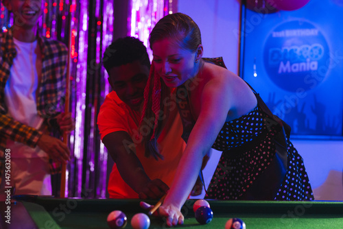 Fototapeta premium Teenagers playing pool at birthday party, enjoying lively celebration atmosphere