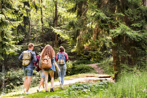 Obraz premium Teenagers with backpacks hiking in forest. Summer vacation.