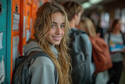 Fototapeta premium Teens Chatting and Preparing School Supplies at Lockers