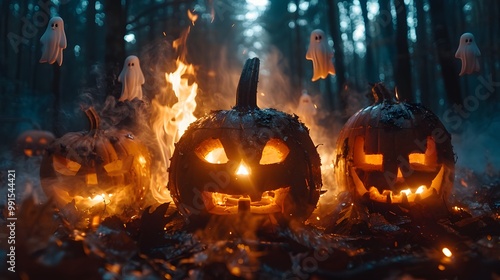 Fototapeta premium Teens gathered around a spooky Halloween bonfire, surrounded by glowing pumpkins and floating ghost decorations, firelight flickering on their faces, dense mist rolling through the dark forest,
