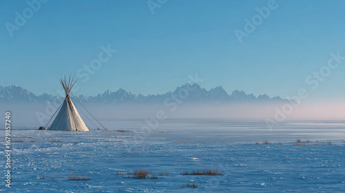 © gino, Obraz premium Teepee Tent in Snowy Field with Mountains