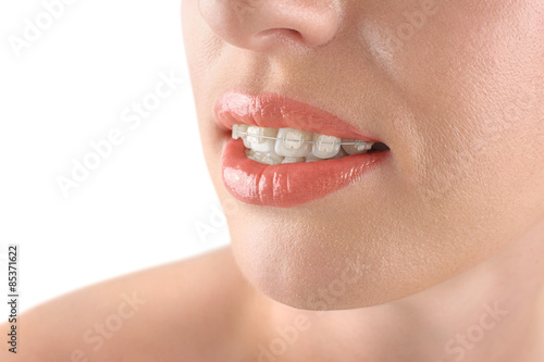 Fototapeta premium Teeth alignment. Braces. Beautiful woman smiling.