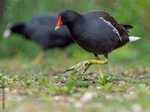 © Tobias, Obraz premium Teichralle an Land laufend mit Blässralle im Hintergrund