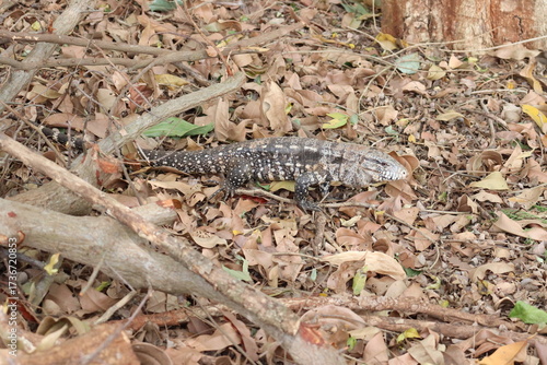 © ALESSANDRO, Fototapeta premium Teiu lizard walking calmly on dry leaves