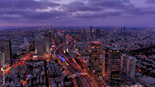 Fototapeta premium Tel aviv city skyscarpes and traffic at night, Aerial Drone view from Tel...