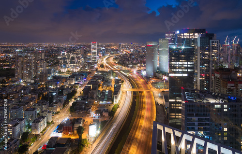 © Алексей Голубев, Fototapeta premium Tel Aviv, Israel. Ayalon river top night view. Modern glass skyscrapers