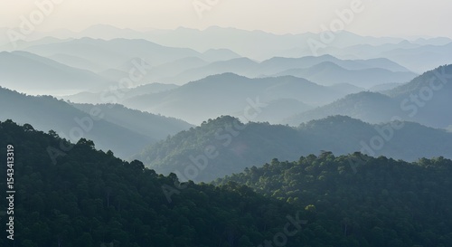 © Jafar, Fototapeta premium Telephoto Compression of Hazy Jungle Hills in Lampung, Professional Medium Format Capture