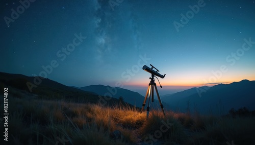 Fototapeta premium Telescope on tripod points at starry night sky over mountain landscape. Astrophotography equipment ready for capturing deep space images. Exploring universe during twilight.